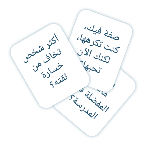 بطاقات الأسئلة هي محور اللعبة الأساسي، حيث تضيف الحماس والفضول لجلساتكم، وتحثكم على الحديث عن الحياة، العمل، الأمنيات، العلاقات، النشاطات الترفيهية، وغيرها من المواضيع التي تعرفكم بمن حولكم، وأنفسكم.